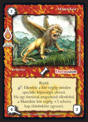 Mantikór (8): Ez a szörnyeteg már inkább olyan lap, ami valóban be fog férni versenypaklikba is - még ha hármat nem is használnék belőle, egy-két darab jól jöhet. Megfelelő pakliba a plusz sebzés megszerzése nem lehet túl nagy kaland, hisz amúgy is agresszív - mondjuk molluszkos - pakliba rakjuk be, ahol bizony az olcsó sebzés okozásra törekedni fogunk. Ha majdhogynem borítékolható a +3 sebzés, akkor a kettőért 7et ütő repülő lény szerintem jónak számít. Lények elleni képessége is érdekes, de szerintem elég marginális, hisz az agro pakliba ölés a cél, és gyakran el tudunk játszani az ellenfél őrposztja mellett.