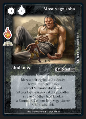 Most vagy soha (7): Óriási kockázat és relatív kicsi előny - de ha bejön, akkor megnyerjük a meccset. A kockázatvállalásunk első lépcsőfoka, amikor áldozunk vagy dobunk két lapot. Manapság ez az ár már több mint vastagnak tűnik, tekintve, hogy agresszív pakliba fogjuk berakni, ahol nem az erőforrás fölény kiépítésén mesterkedünk, hanem a mihamarabb kicsikarható győzelemre. Az ilyen pakliknál meg ugye 3 lap befektetéssel gyakorlatilag kijelenthetjük, hogy kb. feltesszük a meccset erre a nyolc sebzésre. Főleg ha hozzávesszük, hogy sikere esetén a paklink is a kukában landol. Szerencsére a gyógyulás nem minden pakliban lapul, de bizony elbúcsúzhatunk a győzelemtől, ha az ellenfél kijátszik mondjuk egy Visszavágást. Lassan járj!-os hordába remekül működik - csak igyekezzünk Árnylordot is húzni mellé.