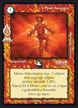 Urgod haragja (7): Tűz pakliba biztos beraknám. Más deckbe aligha. Egy Láncvillám általában hasznosabb nála - remek dolog lényt is leszedni, miközben játékost is sebezzük. Ezt itt sajnos nem tehetjük meg. Pedig a húzás miatt izgalmas lap lenne.