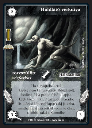Holdlátó vérkutya (7): Itt az első nem-galetki lap (4 ilyen is van a Zénben, plusz Mer-gah, mint határeset). Először is tisztázzunk 2 dolgot: korábbi verziójához hasonlóan ez is csak asztalról gyűjtőbe kerülésnél működik, és nem számít húzásnak, azonban  keresésnek igen. "keresés még az is, ha a paklimból, vagy annak x lapjából (és x akár egy is lehet), vagy a kiegészítő pakliból a saját döntésem szerint, vagy valamilyen feltétel alapján vehetek kézbe lapokat, vagy rakhatok ki az asztalra, a gyűjtőbe vagy a pakli tetejére."