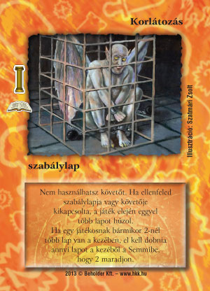 Ami nagyon érdekes ennél a lapnál, hogy magát a játékot is megkavarja, folyamatos plusz döntést jelent, hogy húzás után a kezünkben levő lapokból melyeket tartsuk meg (ez sajnos persze lassítja is a játékot), ez a jó játékosoknak kedvez. Biztos vagyok benne, hogy sokan, sokféle pakliban fogják kipróbálni ezt a lapot. Előnye még, hogy nem kell nagyon speciális irányba elvinni a paklit, tehát ha kikapcsolják, akkor sem elveszett a koncepció, és még laphátrányba sem kerülünk. Megjegyzés: ha mindkét játékosnak több, mint két lapja van (pl. a játék elején), akkor te, mint a Korlátozás gazdája, dönthetsz úgy, hogy előbb az ellenfél dobjon, ezzel is plusz információhoz jutva.