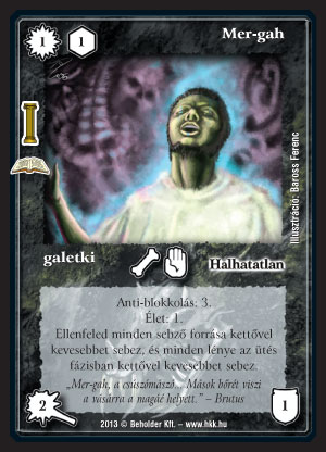 Mer-gah (8): Alapvetően side lap, annak viszont nagyon erős és sokféle pakli ellen jó. Elsősorban a sok lénnyel ütögető koncepciókat fogja zavarni, gondoljunk csak Leah, Chara-din vagy Raia követőjére, avagy egy Lassan járjas hordára. De nem örül neki a Molluszk sem, vagy a csontos pakli. Kikapcsolhat gonosz kis kombókat, mint a magzatos, vagy akár egy Morgan átkozott ajándéka egy Bűvös erdőben. Ha lényes a környezet (pl. Veszélyes faj verseny), akkor használnám alapból is. Ha pedig két ilyen lejön, az ütő lények annyira lecsoffadnak, hogy a 2 Mer-gah gyakorlatilag önmagában megoldja a helyzetet, az élettel védve a korai pusztulástól.