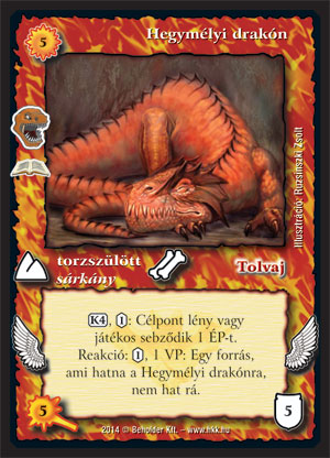 Hegymélyi drakón (7): A minikiegészítő megjelenésekor láttam egy-két, a drakónra nem kedvező kommentet. Nagyjából egyetértek velük. Én a tesztelés alatt nem használtam a lapot, másnál láttam csak (pl. Balázsnál). Igazából olyan, mint a modern HKK lapjainak jó része: nem rossz, de vannak náluk jobb lapok. Sokat dob rajta az, hogy zanszilánk a költsége, de akkor már pl. Ouitmlen jobb nála. Az láthatatlan, jöhet olcsóbban, leszed egy lapot, mágikusan véd. Igaz, a drakón jobban védett, de elég VP igényes az, hogy megvédjem. Egy nagy lénytől manapság azt várjuk, hogy legyen nagyon nehezen megoldható, és vagy üssön sokat, vagy pusztítsa a lapokat. A drakónnál az üssön sokat feltétel teljesül a sebzéssel, de egy normál pakli nem sokáig bírja a nekronozást, csatamezőbe való, amik mostanában tombolnak. A bevédése pedig, mint említettem túl költséges lehet. Ennek ellenére nem rossz lény, előkerülhet korlátozott formátumokon, de ha elpusztul, a fejfájára ezt írnám: VOLT NÁLA JOBB!