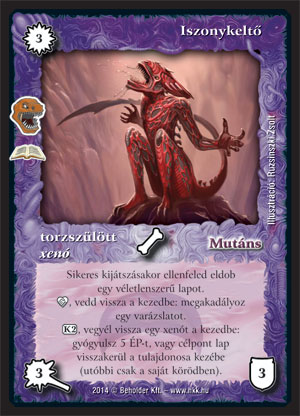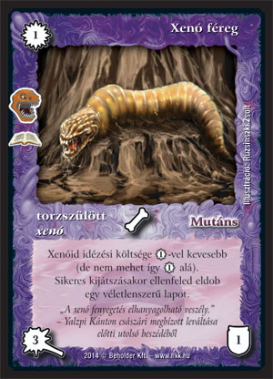 Xenó élősködő (7): A régi verziója a maga idejében jó kis lap volt. Akkor még nem hemzsegtek az asztalon maradó, körönként használható lapleszedések. A mostani sem rossz, de azért nem egetverő. Szerencsére olcsóbb mint a korábban bemutatott másik két xenó. Kijátszásakor dobat, drágítja a reakciót. Már nem egy haszontalan lap. A lapleszedése viszont lassú, csak egy körrel később történik, mivel nem repül. Persze emiatt jó a keltetőbe, de lapleszedésként így egy picit gyenge. Keltetős, Chara-din követős xenó pakliba azért befér. A fejfája így nézne ki: Bár hamarabb tudott volna pusztítani!