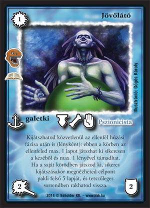 Jövőlátó (8): Jé, egy galetki! Nincs olyan sok belőlük manapság. Ez szerintem a jobbak közül való. Nem kell mellé a követő, hogy első körben jöjjön, így nem galetki pakliba is jó lehet. Védekezik, korlátozza az ellenfelet. Ha a saját körben jön, akkor kevésbé korlátoz, cserébe viszont kontrollálhatom azt, hogy mit húz az ellenfél a következő pár körben. Szerintem jó lap a megfelelő koncepciókba, de a védekezése miatt még a kiegészítő pakliba is bekerülhet pörgős paklik ellen. A fejfa szövege nálam a következő lenne: Ha felhúztam volna, az ellenfél se dalolt volna! J