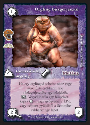 Orgling bűzgerjesztő (7): Voltak időszakok, amikor a HKK fórumok az orglingok kitiltásáról beszéltek. Azóta perzse bebizonyosodott, hogy nem olyan erős azért az a pakli, hogy erre szükség legyen. Nem akartunk átesni a ló túloldalára, így az orglingok ezúttal csak kisebb erősítést kaptak. Erre jó példa az orgling bűzgerjesztő. Hasznos kártya, ha teljesen orgling paklit rakunk össze, hiszen VP-t ad, gyógyít, vagy megold egy-egy idegesítő lapot a gyűjtőben. Ellenben, ha csak az alap orgling kombót rakjuk össze (áldozati, ősanya, mágus), mondjuk legendás lényekkel, vagy más körítéssel, akkor ez a lap oda nem nagyon fér be. Veszélyes fajon, és hasonló formátumokon biztosan alap lesz az orglingok között, és a használatával erősödik a pakli. Ennek mit írnék a fejfájára? Ezt: Ha a bűzhöz nem kellene sebezni, ő is gyakrabban bűzölgött volna!