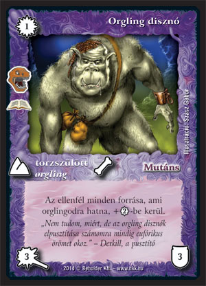 Orgling disznó (6): Az orglingok már eddig is elég jól be tudták védeni magukat a mágussal. Be tudták drágítani az ellenfelet a tanácsadóval. Így ez a disznó nem tűnik olyan fontosnak. Persze több drágítás, több védelem mindig jó, a kérdés az, hogy befér-e. Szerintem csak ritkán, inkább csak a kiegészítőpakliba. A fejfára ezt írnám: Ha a mágus nem lett volna, az én disznóm is nagyobbra nőtt volna!