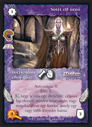 Sötét elf úrnő (8): Egy újabb ében íjász, amit többnyire nem az etnikumával együtt látunk majd. Az élet: 2 képesség már predesztinálja, hogy életes pakliba érdemes bevetni. Halhatatlanok nagymestere mellett próbáltam a tesztelés alatt, elég jó volt. Kissé drága 3 VP-ért, de a nagymester mellett 3 lapot old meg, és ráadásként marad egy lényünk is. Kár, hogy a legnépszerűbb, legerősebb vonalba, a Hegymélyi keltetősbe nem passzol, mivel repül. Ennek ellenére szerintem látjuk majd néhány a versenyasztalokon néhány formátumban. A fejfa szövege: Szárnyalt volna a paklim, ha nem lett volna szárnya!