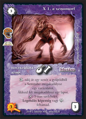 X 1, a xenomorf (8): Újabb xenomorf, hasonlóan az Iszonykeltőhöz, ez is picit drága. Igaz, ha kijön, utána már a varázslatokkal valószínűleg nem lesz gond. Lapot is tud megakadályozni, etnikumban vagy legendás pakliban feltámad. Ha nagyon kell, és van rá keret, oda tud csavarni egy hatost is. Mindez azonban nem segít azon, hogy a játék elején, amikor a legjobban kellene a counter, ez a 3 VP-s lény ott csücsül a kezünkben tehetetlenül. Igazi erejét a legendás pakliban mutatja meg, ott követővel kettőért jön. Ha keltetőt is használunk mellé, mivel kettőért vég nélkül counterel, és ekkor az ellenfél lapjai is általában legálabb ennyiért jönnek. A fejfája megegyezne az Iszonykeltőével.