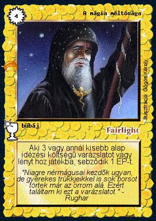 Kiadás: Chara-din visszatér Gyakoriság: nem gyakori Lapszín (isten): Fairlight Típus: bűbáj Szöveg: Aki 3 vagy annál kisebb alap idézési költségű varázslatot vagy lényt hoz játékba, sebződik 1 ÉP-t. Szinesítő szöveg: "Niagre nérmágusai kezdők ugyan, de gyerekes trükkjeikkel is sok borsot törtek már az orrom alá. Ezért találtam ki ezt a varázslatot." - Rughar Illusztráció: Gőgös Károly