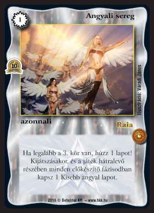 Kiadás: Alappakli, 10. kiadás, Alappakli, 11. kiadás Gyakoriság: ritka Lapszín (isten): Raia Típus: azonnali Szöveg: Ha legalább a 3. kör van, húzz 1 lapot! Kijátszásakor, és a játék hátralevő részében minden előkészítő fázisodban kapsz 1 Kisebb angyal lapot. Illusztráció: Váradi János