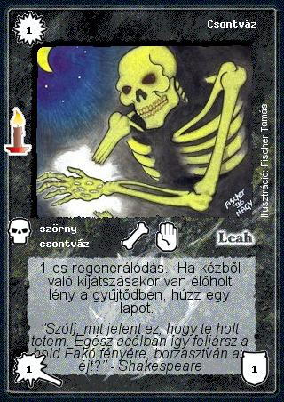 Kiadás: Múltidéző Gyakoriság: gyakori Lapszín (isten): Leah Típus: szörny Altípus: csontváz Szöveg: 1-es regenerálódás. Ha kézből való kijátszásakor van élőholt lény a gyűjtődben, húzz egy lapot. Szinesítő szöveg: "Szólj, mit jelent ez, hogy te holt tetem. Egész acélban így feljársz a hold Fakó fényére, borzasztván az éjt?" - Shakespeare Illusztráció: Fischer Tamás