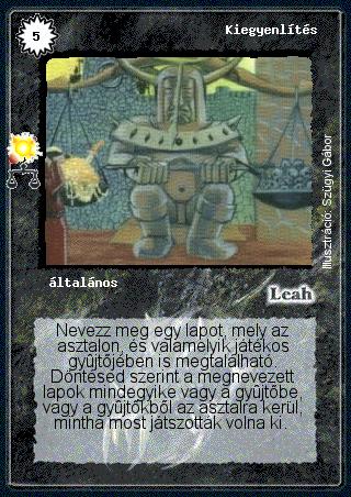 Kiadás: Mérleg (Csillagképek) Gyakoriság: ritka Lapszín (isten): Leah Típus: általános Szöveg: Nevezz meg egy lapot, mely az asztalon, és valamelyik játékos gyűjtőjében is megtalálható. Döntésed szerint a megnevezett lapok mindegyike vagy a gyűjtőbe, vagy a gyűjtőkből az asztalra kerül, mintha most játszották volna ki. Illusztráció: