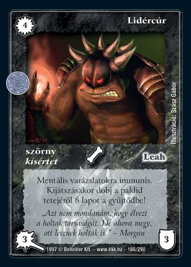 Kiadás: Isteni szövetség, Túlélők Földje, Védnök 2025 Gyakoriság: nem gyakori Lapszín (isten): Leah Típus: szörny Altípus: kísértet Szöveg: Immunis a mentális varázslatokra. Sikeres kijátszásakor dobj a paklid tetejéről 8 lapot a gyűjtődbe (ha kevesebb van, annyit). Illusztráció: Szász Gábor