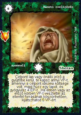 Kiadás: Legendák Völgye Gyakoriság: ritka Lapszín (isten): Sheran Típus: azonnali Szöveg: Célpont lap vagy önálló jelző a gyűjtőbe kerül, te kapsz annyi VP-t, amennyi a célpont idézési költsége volt, majd húzz egy lapot, és gyógyulsz 4 ÉP-t. Ha ebben vagy az előző körben VP-t vesztettél az ellenfél forrásának köszönhetően, kijátszhatod 0 VP-ért. Illusztráció: Ruzsinszki Zsolt